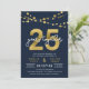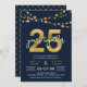 Convite de aniversário de 25 anos elegante com cordas de luz e "25" em dourado falso com "anos juntos" em branco contra um fundo azul escuro. O cartão inclui um verso com padrão correspondente. Confira itens correspondentes, como adesivos e selos, aqui https://www.zazzle.com/collections/strings_of_lights_faux_gold_celebration_collection-119311942951401241?rf=238364477188679314