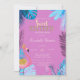 Esses convites apresentam flamingos cor-de-rosa e folhas tropicais azuis em fundo cor-de-rosa. Este convite é facilmente personalizado para o seu evento simplesmente adicionando os seus detalhes.