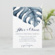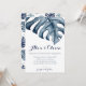 Uma bela seleção de folhas monstera tropical monocromáticas de cor aquática azul. Fácil de personalizar com as suas informações de casamento. Parte da nossa coleção de "Folhagem Tropical Azul".