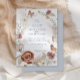 Design de convite de casamento para flores silvestres BOHO, frescas e modernas, foi pintado manualmente em aquarela por uma artista e designer internacionalmente licenciada, Audrey Jeanne Roberts. As flores silvestres, secas, cor de lama, são dispostas numa coroa oval solta, com uma arte de linhagem e um par de borboletas delicadas, erva de pampas e verde-folha de gingko. Esta versão tem uma frente branca clara e arejada com texto azul de ardósia e fundo no verso. Direitos autorais.
