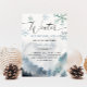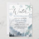 Cartão de convite de aniversário do garoto moderno com a arte aquosa da montanha de inverno com pinheiros com flocos de neve azuis. O texto diz "Wonderland de inverno".