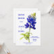 Uma fotografia única "de um tipo" de uma flor do Texas Bluebonnet com caule e folhas. Um fecho das pétalas azuis e um fundo macio que desaparece para um branco limpo. Um design moderno do tipo na cor azul da flor. Preencha com suas informações de casamento na parte de trás deste conjunto único de convites para o casamento.