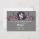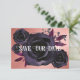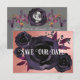 Rosas de aquarela roxas escuras e escuras com folhagem roxa decoram este elegante e moderno gótico Salve nossa Carteira. O verso é uma cinza de pedra com um texto tradicional branco, adornado com um rosa preto central como quadro para sua foto de casal. Entra num reino onde os elementos góticos entram em contato com a estética moderna no nosso casamento gótico negro Salve nosso encontro. Uma celebração do amor e da escuridão aguarda, onde os espíritos dançam sob o luar e o feitiço do amor não conhece limites.