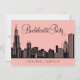 Os convites para festas de solteira de casamento de na moda apresentam a silhueta de estilo deco de arte vintage de centro Chicago, Illinois. Em preto e coral, cor-de-rosa.