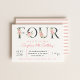 Bonito flores cor-de-água cor-de-rosa e cor-de-água cor-de-rosa, e delicadas letras verdes de cor-de-rosa, adornadas em negrito, convite de festas do 4º aniversário. "Quatro" florais bonitos e femininos com design de tipografia de tendência. A parte traseira da placa coordena o padrão de faixa de cor d'água rosa.