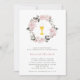 Este doce e elegante convite religioso da Primeira Comunhão apresenta uma coroa rosa, muda e vintage, com peônias e rosas de aquarelas, e folhas de cinzas escuras, sobre fundo branco. Um cálice de comunhão também é apresentado, e o verso do convite é uma cor de pincel suave com bolinhas brancas giras.