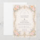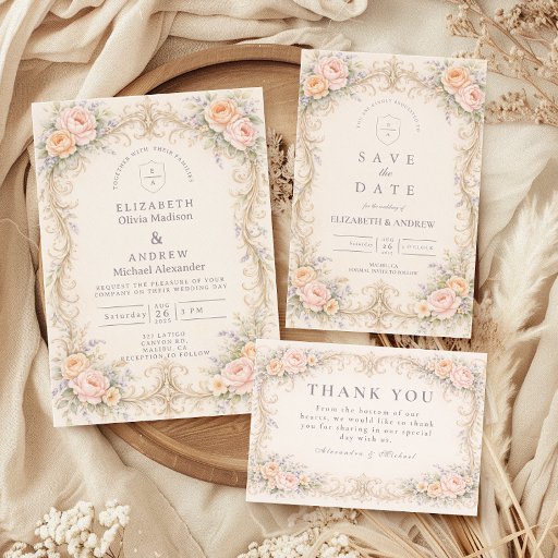 A timeless baroque composition framed with sculpted champagne scrollwork and blooming blush and peach roses. Soft ivory florals and muted greenery add depth while keeping the palette airy and refined. The symmetrical layout creates a regal, European-inspired silhouette that feels both romantic and elevated. Perfect for couples who love classic elegance, pastel florals, and a graceful heirloom aesthetic.