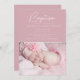 Elegante convite de fotos de batismo rosa para o batismo para a menina. Personalizado com sua foto favorita de recém-nascido, o nome de seu filho e informações sobre batismo. Entre em contato comigo para obter assistência com suas personalizações ou para solicitar outros produtos Zazzle correspondentes ou coordenadores para o seu evento.