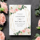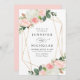 Convites florais elegantes com detalhes de seu casamento cercados por uma estrutura geométrica de folha de ouro falsa adornada com buquês de rosas e tulipas cor-de-água rosa penteados com folhas verdes e de cobre peludas no topo e no fundo. Os convites florais de casamento revertem para um fundo cor-de-rosa claro. Projetado para coordenar com a nossa coleção de casamento Blush Primavera Floral.
