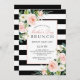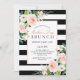 Hospedar um Brunch Dia de as mães com um belo convite com buquês florais de cor d'água de rosas cor-de-rosa pastel e brancas e verde-à-direita em cantos opostos de um fundo listrado preto e branco contrastante. Um layout de texto elegante é usado neste design, pronto para personalizar com seus detalhes.