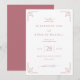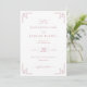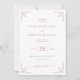 Este convite de casamento elegante apresenta um layout simétrico com um fundo rosa suave, criando uma atmosfera quente e convidativa. O design inclui motivos geométricos espelhados nos cantos em uma tonalidade ligeiramente mais escura de rosa, adicionando um toque abstrato e sofisticado. O texto centralizado é organizado hierarquicamente usando fontes delicadas em script e serif, enfatizando os nomes e detalhes do evento, mantendo um apelo atemporal. O estilo geral combina elementos clássicos e contemporâneos, perfeito para transmitir formalidade e graça, tornando-o ideal para celebrar um momento significativo da vida com calor e refinamento.