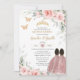 Este convite de aniversário da Quinceañera para gêmeos quíquicos apresenta garotas bonito e marrons vestidas com um vestido de ouro brilhante de rosa / bola esbranquiçada, cor d'água pincelada rosa floral e folhagem verde macia. Personalize-o com seus detalhes de forma fácil e rápida, basta pressionar o botão personalizar para reorganizar e formatar o estilo e a colocação do texto. Também excelente para Sweet 16! c) O Feliz Cat Studio