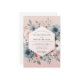 This elegant design features a romantic arrangement of painterly florals. Lush slate blue dahlias and soft blush pink roses are nestled among delicate greenery and white accent blossoms. The soft, dreamy aesthetic is set against a warm, dusty rose background, creating a sophisticated and timeless feel for your union.