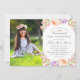 Costume de barato imprimiu convites para o Sacramento Cristão Católico da Primeira Comunhão Sagrada. Personalize o modelo com os detalhes e a foto do evento. Este bonito design botânico apresenta uma moldura de cor d'água de pêssego e flores de lavanda com um fundo listrado no verso. Use as ferramentas de design para carregar sua foto e editar as fontes de texto e as cores para criar um convite floral elegante de primavera.