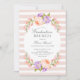 convites de festas personalizados de brunch de graduação personalizados com barato, personalizados com seus detalhes de evento. Este bonito design botânico apresenta uma moldura de aquarela de pêssego e flores de lavanda sobre um fundo listrado. Use as ferramentas de design para personalizar o texto, editar as fontes e as cores ou adicionar suas próprias fotos para criar um convite elegante para a graduação floral do primavera.