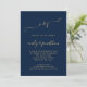 Script Elegante Código QR Marinho Azul e Convite Dourado para Casamento. Com um código QR para o seu site de casamento no verso para que seus convidados possam RSVP e ver todos os detalhes on-line sem a necessidade de gabinetes separados. Seu código QR será gerado automaticamente para atualizar o código de amostra no design, quando você simplesmente alterar o URL de amostra no modelo com o URL do seu próprio site de casamento. Um design totalmente personalizável com suas iniciais no topo em um script na moda com alternâncias. Personalize facilmente o texto, você também pode clicar em Editar para alterar as cores do texto e do plano de fundo, se desejar.