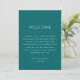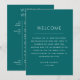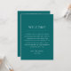 Dê as boas-vindas aos seus convidados com este deslumbrante cartão de itinerário de fim de semana de casamento em tom azul-teal profundo, apresentando um sutil sotaque em turquesa escuro para um visual rico e elegante. Perfeito para casamentos em qualquer estação, este cartão de cronograma minimalista descreve claramente os eventos do seu fim de semana especial. Ideal para casais que amam paletas de cores ousadas e sofisticadas e desejam adicionar um toque elegante à sua celebração moderna, costeira ou inspirada na natureza. Disponível como cartão impresso ou download digital para maior comodidade.