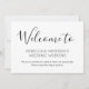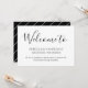 Adicione este bilhete simples, mas elegante, com as bolsas de boas-vindas de casamento para o seu casamento. Este cartão de boas-vindas de casamento apresenta um design simples preto e branco acentuado com texto manuscrito estiloso. O texto personalizado permite que você adicione sua própria mensagem pessoal.