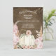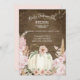 "Chá de fraldas Rustic Wood Pumpkin Pampas Grass Grass, Chamada de Garota Rosa." O fundo de madeira escura dispara uma abóbora branca com flores no estilo BOHO para um tema de chá de fraldas rústico ou chá de fraldas de casal. A design apresenta orquídea rosa penteada e rosa com flores rosadas e suaves, com caules pampas pálidas e folhas de palma secas. O verso tem um fundo cor-de-rosa pálido e pálido. Copyright, artista e designer licenciado internacionalmente, Audrey Jeanne Roberts.