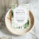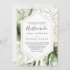 Este convite de casamento para a nuestra verde tropical de ouro geométrico é perfeito para um casamento de destino. O design apresenta ouro de aquarela pintada à mão e palmeiras verdes e folhas de bananeiras com flores cor-de-rosa amontoadas em buquês, enfeitando um quadro geométrico.