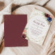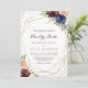 Este convite de casamento para a nuestra floral de ouro geométrico é perfeito para um casamento espanhol moderno. O design apresenta uma aquarela desenhada à mão roxa, marinho, pincel, burgundy, flores marinhos, folhas verdes e douradas que adornam uma elegante armação geométrica