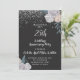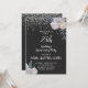 Um convite de bodas de prata de 25 anos elegante com purpurina prateada em preto e flores de rosas brancas nas bordas e tipografia em letra cursiva branca.