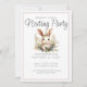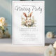 Um coelho doce com elementos florais está centrado neste convite temático da floresta verde-doce floresta. Uma paisagem em tons de verde-aquarela e pêssego como fundo faz disto um convite temático para florestas excelentes e natureza. verde é uma cor neutra do gênero excelente para um chá de fraldas/ninho.