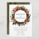 Convites elegantes para o casamento no outono, com os seus nomes rodeados por flores aquáticas e verde em cores autóctones de marfim, laranja, ouro mostarda, verde-oliva, rosa poeirento e castanho. Os convites de casamento florais de outono invertem para mostrar um fundo rico de cor verde-oliva. Projetado para coordenar com a nossa coleção de casamento Floral de Boho Autumn.