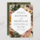 Convites elegantes para o casamento no outono, com os detalhes do seu casamento aninhados num quadro geométrico rodeado por flores de aquarela e verde em cores autóctones de marfim, laranja, ouro de mostarda, verde-oliva, rosa empoeirado e castanho. Os convites de casamento florais de outono invertem para mostrar um fundo rico de cor verde-oliva. Projetado para coordenar com a nossa coleção de casamento Floral de Boho Autumn.