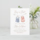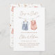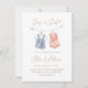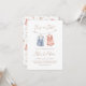 Um gênero boho revela um convite com uma ilustração feita com uma aquarela pintada à mão de roupas azuis e cor-de-rosa numa linha de roupa. A parte superior do cartão diz "Menino ou Menina?" mas pode ser editada para "Ele ou ela?", "Azul ou Rosa?", "Chá de fraldas" ou qualquer título personalizado. Os detalhes do evento estão em um layout moderno com os nomes dos pais em letras elegantes de script. Cartões que se revertem a um padrão fofo de artigos para bebês incluindo meias, calçados, brinquedos e pequenas estrelas laranja. Veja a coleção vinculada nesta página ou visite nossa loja para mais convites para chuveiros de bebês.