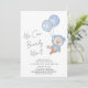 O convite para o chá do bebê Boho apresenta uma ilustração de uma aquarela fofa de um ursinho azul flutuando com balões e "Nós podemos esperar mais cedo" em um roteiro de caligrafia manuscrito.