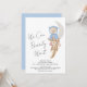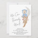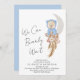 O convite para o chá do bebê Boho apresenta uma ilustração de aquarela fofinha de um ursinho azul sentado sobre uma lua prateada e um buquê bege e terracota de florais e grama pampas, e "Nós podemos esperar mais cedo" em um roteiro de caligrafia manuscrito.