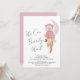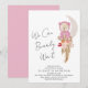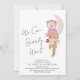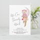 O convite para o chá de uma menina de Boho com uma ilustração de aquarela fofa de um ursinho de pelúcia sentado sobre uma lua prateada e um buquê rosa e terracota de florais e grama pampas, e "Nós podemos esperar mais cedo" em um roteiro de caligrafia manuscrito.