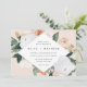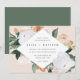 O convite para o casamento floral elegante apresenta os detalhes do seu casamento em letras modernas, em um quadro em forma de diamante geométrico de flores de aquarela pastel e folhagem botânica em tons de terra inspirados no deserto, de pêssego, verde-sábio, branco e marfim.