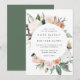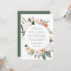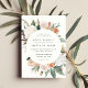O convite para o casamento floral elegante apresenta os detalhes do seu casamento em letras modernas, em um quadro redondo de flores de aquarela pastel e folhagem botânica em tons de terra inspirados no deserto de pêssego, verde-sábio, branco e marfim.