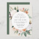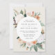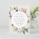 O convite para o casamento floral elegante apresenta os detalhes do seu casamento em letras modernas, em um quadro redondo de flores de aquarela pastel e folhagem botânica em tons de terra inspirados no deserto de pêssego, verde-sábio, branco e marfim.