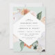 O convite para festa de noivado floral elegante apresenta um quadro em forma de diamante de flores a aquarela e folhagem em tons de pêssego, branco, marfim e verde-sábio inspirados no deserto de boho. Personalize com seus detalhes de festa de noivado em letras modernas.