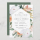 O Elegante convite para janto de ensaio floral apresenta um elongado quadro hexagonal de flores de aquarela e folhagem em tons de pêssego, branco, marfim e verde-sábio inspirados no deserto de boho. Personalize com seu ensaio de cerimônia de casamento e jante detalhes em letras modernas.