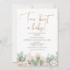 Boho Blush Cactus Taco sobre um bebê Convite para bebê Taco sobre o convite para chá de fraldas para uma menina com um adorável arranjo de cacto floral embaçado e textura esmaecida e esmaecida ao redor do convite. A parte de trás é uma imagem falsa de ouro pálido e rosa.