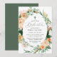 Lindos convites Dedicações com um elegante tom pastel neutro e neutro molhado de cor aquática quadro floral botânico em tons suaves de pêssego, laranja, pincel suave, amarelos e muitos tons de verde de sábio verde a verde brilhante e profundo. Seus detalhes personalizados são exibidos em um elevado layout tipográfico que coloca a doce menina na frente e no centro.