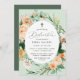 Lindos convites Dedicações com um elegante tom pastel neutro e neutro molhado de cor aquática quadro floral botânico em tons suaves de pêssego, laranja, pincel suave, amarelos e muitos tons de verde de sábio verde a verde brilhante e profundo. Seus detalhes personalizados são exibidos em um elevado layout tipográfico que coloca a doce menina na frente e no centro.