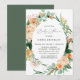 Lindos convites para bebês com um elegante tom pastel neutro e neutro molhado de cor aquática quadro floral botânico em tons suaves de pêssego, laranja, pincel suave, amarelos e muitos tons de verde de sábio verde a verdes brilhantes e profundos. Seus detalhes personalizados são exibidos em um elevado layout tipográfico que coloca o convidado de honra em frente e no centro.
