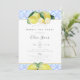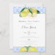 Um convite de chá para uma festa de chá de noiva, moderna e moderna, com limões amarelos, desenhados à mão em lápis de aquarelas e coloridas sobre um padrão de azulejos azuis inspirado nas tradições mediterrânicas. Personalize-o com o nome, a data, a hora e todos os detalhes. Caligrafia moderna para o nome da noiva e um quadro de ouro para o fundo.