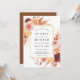 Este convite para o casamento apresenta flores rústicas de aquarela em terracotta, burgundy, laranja queimada, amarela, cor-de-rosa-pincel com beige e grama-pampas marrom, e um quadro de retângulo dourado. Para personalização mais avançada deste design, clique no link "personalizar mais". Itens correspondentes também estão disponíveis.