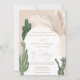 Cacto verde do deserto do Boho Tropical e convite de casamento de erva dos pampas com cactos selvagens, cor d'água dos pampas, arco em forma de tons de terra mutada com bege claro e cor de terracota com arco arenoso bege.