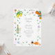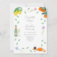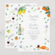 Convite de casamento em aquarela colorida moderna e bonita com botânicos boho simples, tema cítrico de laranja e limão ideal para um casamento de verão ensolarado. Arte original da artista Catherine Sweetman inclui folhagem, flores silvestres, queijo e vinho, notas musicais e taças de espumante. Caligrafia caprichosa e tipografia moderna com modelos fáceis de personalizar para adicionar nomes, data e outras informações essenciais junto com as iniciais dos noivos na ilustração da etiqueta da garrafa de vinho espumante. A paleta de cores inclui limão, amarelo, laranja, verde, azul, roxo e rosa.