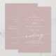 Este convite de casamento de rosa cor-de-rosa e poeirento é perfeito para um casamento minimalista. O rosa de design boêmio moderno cor-de-rosa-pincel-azul-, neutro, apresenta uma caligrafia rústica simples com um estilo único, mas clássico. Salve o papel, incluindo mais detalhes na parte traseira do convite em vez de em uma placa de gabinete separada.