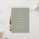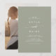 Este convite de casamento de fotos casual verde de sábio boho é perfeito para um casamento minimalista. A moderna design boêmica verde-luz neutra apresenta uma caligrafia rústica simples com um estilo único, mas clássico. Personalize a parte de trás do seu convite de casamento com a sua foto de noivado favorita.