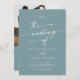 Esta foto de um boho chic seafoam e o convite de casamento de código QR é perfeito para um casamento minimalista. A colorida design boêmica verde-azul apresenta uma caligrafia rústica simples com um estilo único, porém clássico, que lembra a praia, o oceano e o litoral de verão. Personalize a parte de trás do seu convite de casamento com a sua foto de noivado favorita. Inclua um código QR para convidado para RSVP fácil, ver detalhes ou ambos.