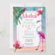 Cor rosa, azul e uma mistura de cores tropicais que provoca a imagem de uma praia cor-de-água rosa a desaparecer num oceano de cor-d'água e no céu cercado por folhas tropicais. O dorso é enfeitado com palmeira e arbusto de abacaxi antigos para completar o olhar. Um painel com borda dourada na frente cobre o fundo tropical para enquadrar seus detalhes de celebração da Festa de aniversário "Aloha". Design composto por Holiday Hearts Design (direitos reservados).